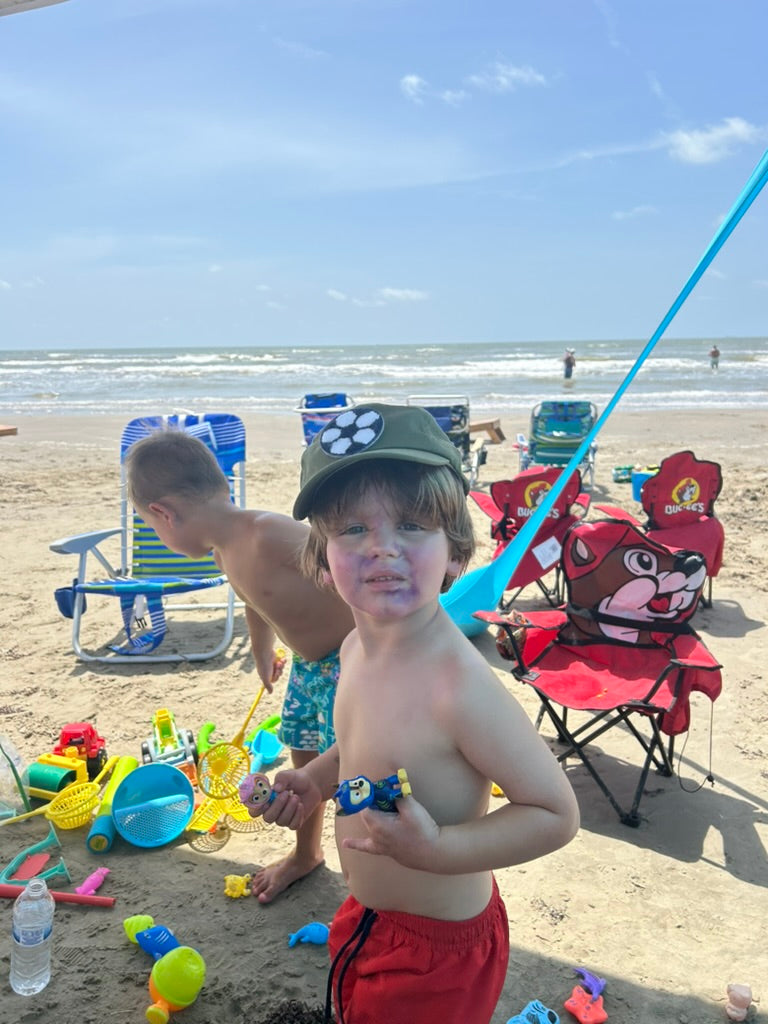 Silas getting sandy with his favorite Sprout hat and soccer patch! GOAL! - Texas USA