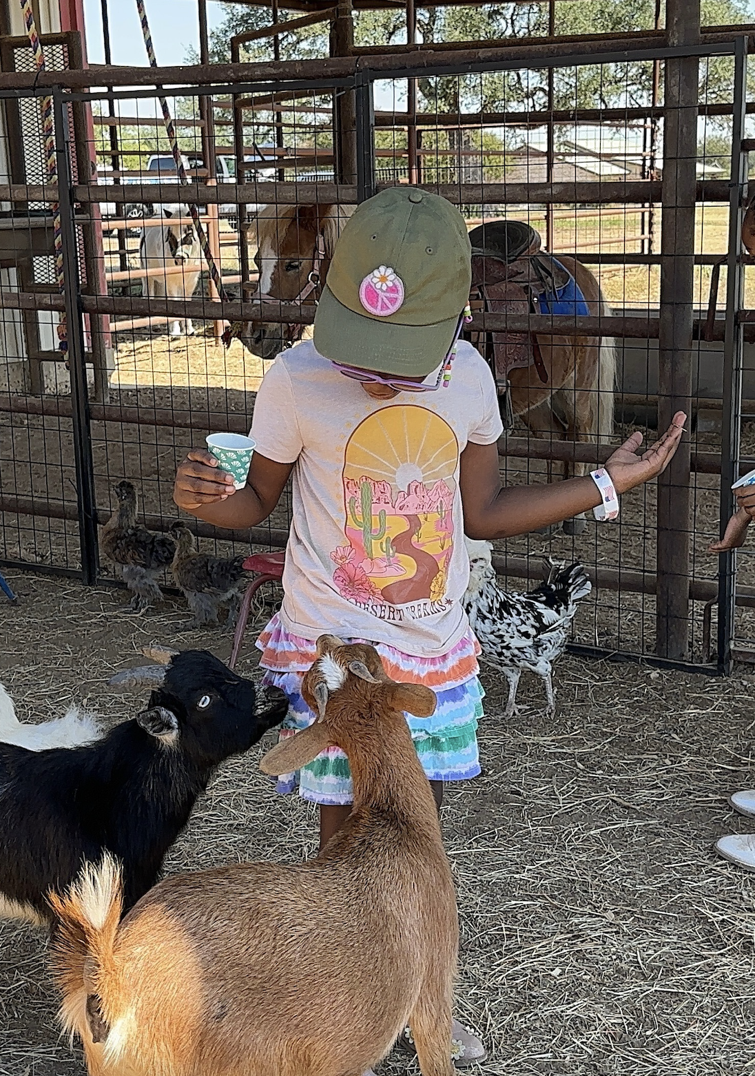 Zāli making new goat friends in her Sprout hat and Peace Please patch! — Texas, USA